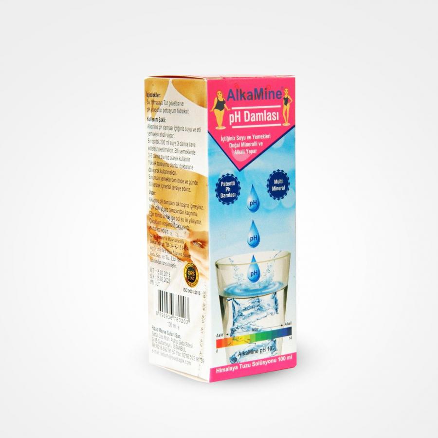- AlkaMine®Ph damlası, 84 Organik Mineralli Himalaya tuzu eritilerek elde edilen %26 lık çözeltinin doğada pH’ı en yüksek mineral olan potasyum hidroksitle karıştırılarak elde edilen, insan vücudunun alkali olması için çok faydalı patentli bir karışımdır.